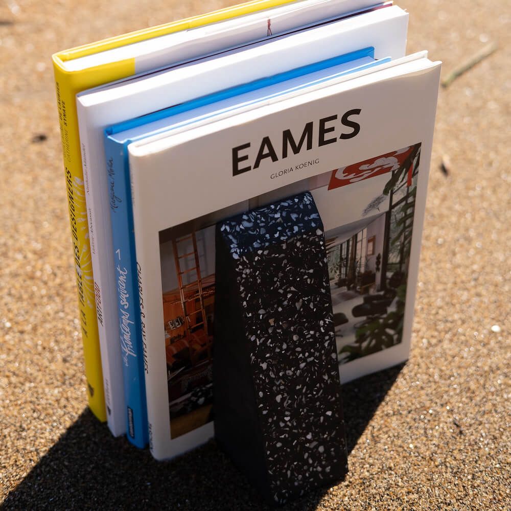 Le serre-livres Hélios séduit par son design épuré et sa texture brute, relevée par les reflets nacrés des coquillages réemployés qui le composent.